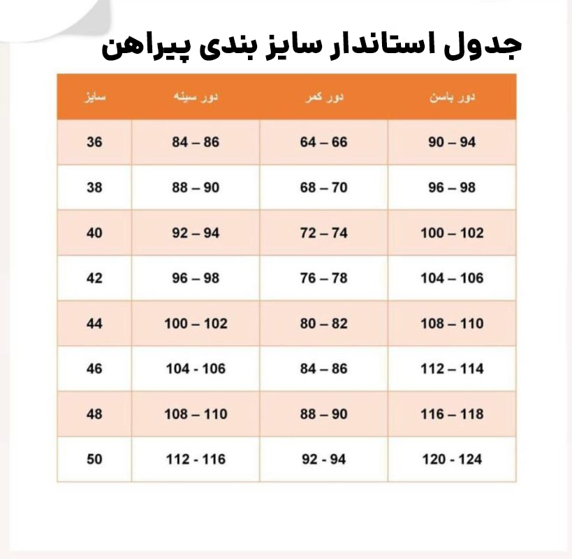 اندازه ها ،اندازه های به طور کیپ اندام شماست و لباس ها ۵-۷ سانت نسبت به اندازه دور سینه شما آزادی استاندارد و لازم رو دارند